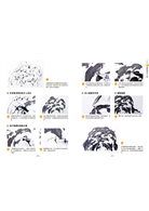 ▲很多人教你畫山和水,但是誰教你畫爆炸和水晶?你曾經試著描繪過爆炸的場面嗎?是不是覺得不像藍天白雲一樣隨處可見,甚至於還沒有掌握到火焰流動和濃煙滾滾的光影變化,正為此而苦惱?熊熊烈火不具形體,難以捉摸,不想畫得太僵硬,太過隨興又格格不入,透過大小不一的圓形基準線,你會獲得新的繪圖思路。水晶的形狀很複雜,光線會朝向各個方向折射,如果一筆一畫精雕細琢,既麻煩又費時,利用保鮮膜和墨水,複雜的表現可以輕鬆實現,完成後再根據形體加筆……你學起來了嗎?