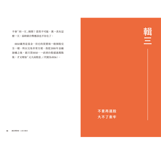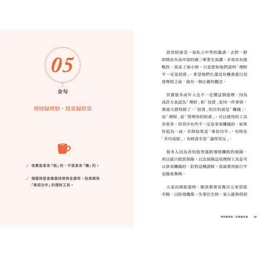 →「一個人不可能精通很多知識,只懂皮毛,才是最危險的。……在理財上,真的不用懂太多,只要懂能賺錢的一、兩招就夠了。」