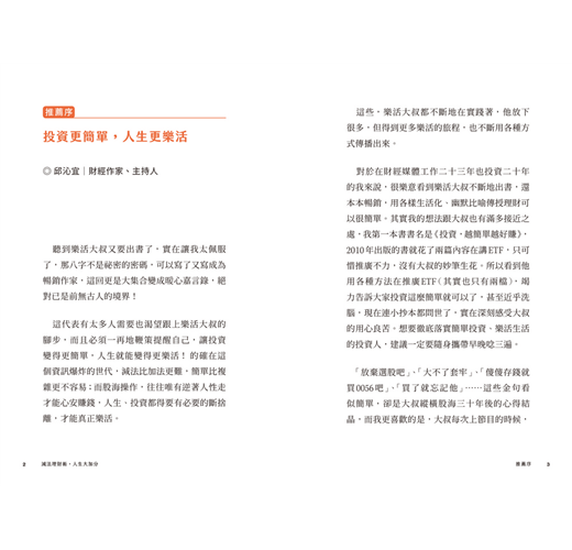 他從不以「理財專家」自居,反而喜歡大家以「樂活大叔」來稱呼他。追隨他的粉絲愈來愈多,除了因為他的「投資技巧」簡單易行外,他正向的「人生態度」更讓大家得到很多啟發。
