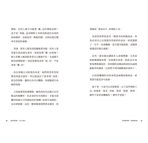 →「保費是拿來『賠』的,不是拿來『賺』的。……儲蓄險是會嚴重排擠資金運用、投資績效『事倍功半』的理財工具。」