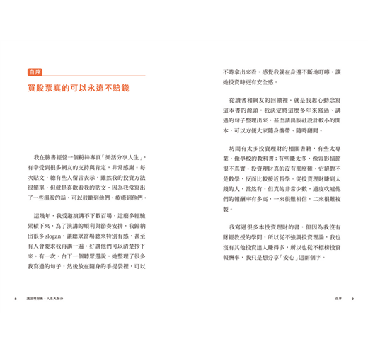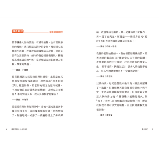 以前的我,每天追著股市數字跑,雖然好運賺了一點錢,但發現整天腦袋裡面全是數字與不安,生活品質與睡眠變得很差,但自從看了樂活大叔的書之後,「穩穩賺才能賺得長久」與「大不了套牢」這兩個觀念深深打動了我,所以我現在不但可以安穩睡覺,而且投資讓我覺得很快樂。
