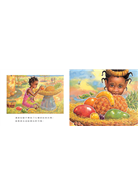 艾琳.布朗描繪了正向、健康、爽朗的盧歐族女孩,也將小讀者熟悉、喜愛的八種熱帶水果對應八種非洲動物放入書中。繪本用色溫暖、飽和,構圖大膽,畫面充滿了生命力。創作者運用翻頁的時空轉換來推進情節,利用主角與讀者的認知落差,製造出幽默的效果與故事張力。