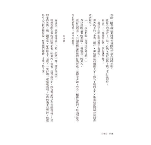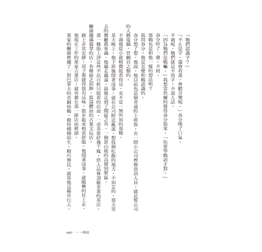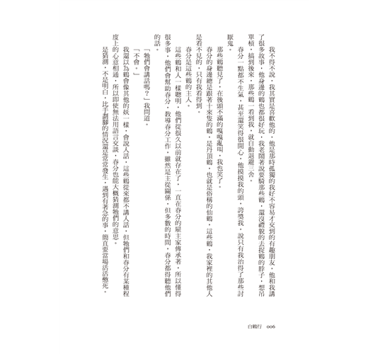 我還以為鶴會像其他的妖一樣,會說人話,這些鶴從來都不講人話,但牠們和春分有某種程度上的心意相通,所以即使無法用語言交談,春分也能大概猜測牠們的意思。