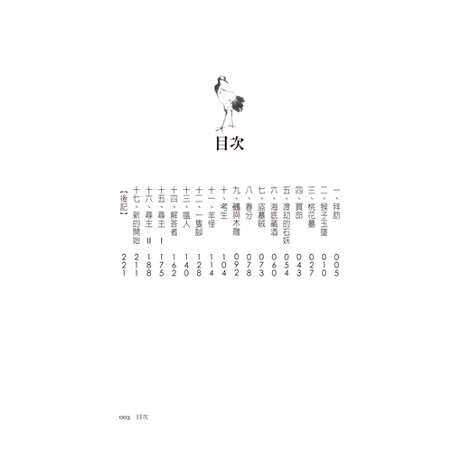 總是隨候身旁的仙鶴大軍、沒有眼睛的猴子玉墜、喉嚨黏滿花瓣的怪症、海底被龍王守衛的四合屋、一隻烏黑詭異的右腳……