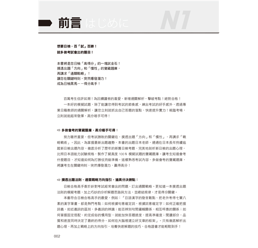一本好的模擬試題,除了能讓您得到考試的節奏感,練出考試的好手感外,透過專業日籍教師的通關解析,讓您立刻就抓出自己答題的盲點,快速提升實力!親臨考場,立刻就能超常發揮,高分唾手可得!