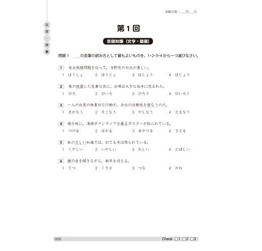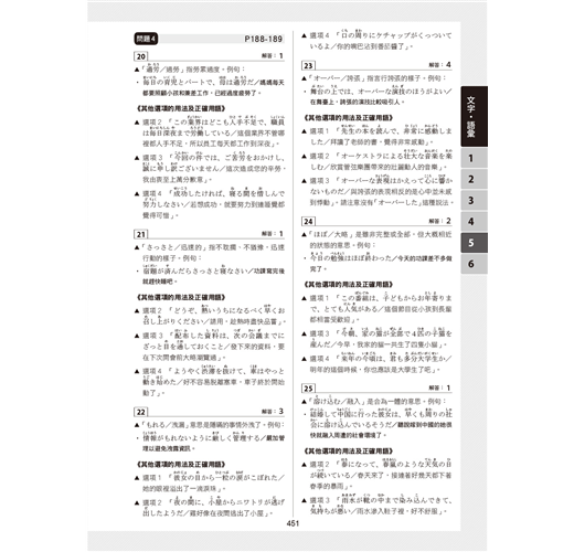 為了讓您熟悉正式考試的節奏,本書集結6回大份量模擬考題,全部都按照新日檢的考試題型來製作。您可以按照正式考試的時間計時,配合模擬考題,訓練您答題的節奏與速度。考前30天,透過6回密集練習,讓您答題可以又快又正確!事前準備萬全,就能提高您的自信心,正式上場自然就能超常發揮,輕鬆取得加薪證照!