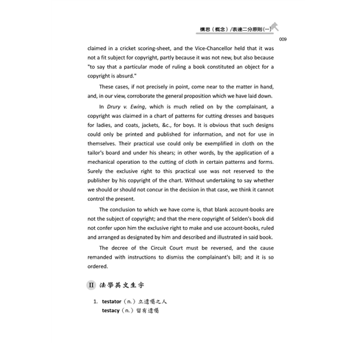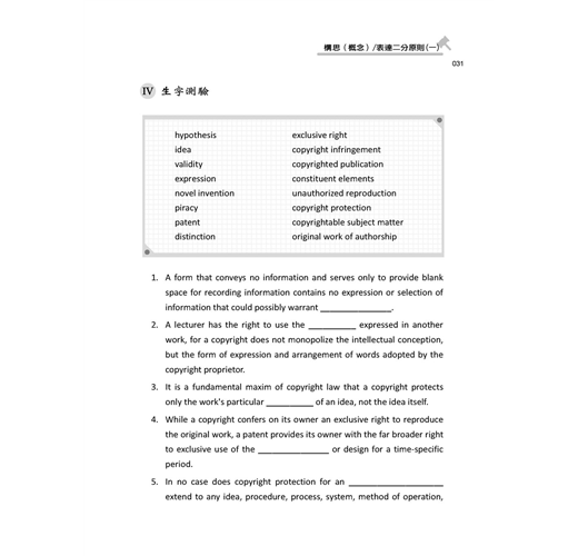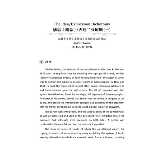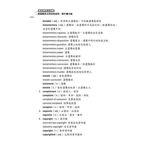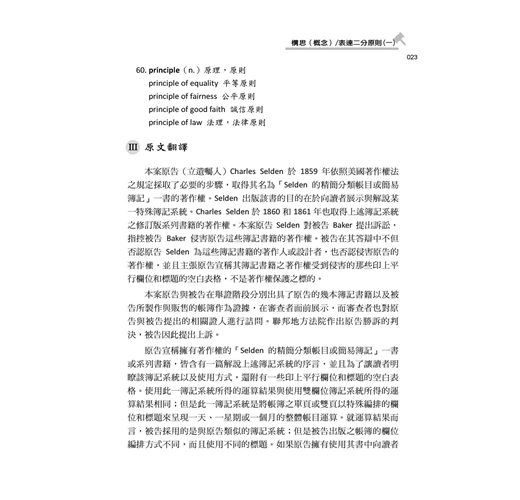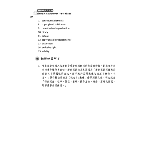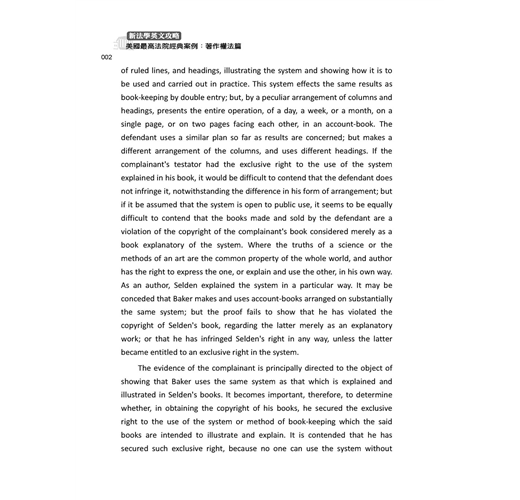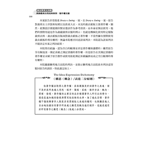 本書選定「美國著作權法」作為收錄案例的軸心,挑選美國最高法院歷年來所做影響著作權法制度改革的重要判決,以幫助讀者在學習法學英文之同時,也能知悉美國著作權法的重要法理、原則和標準。本書收錄案例的標準也涵蓋這幾年我國司法制度變革、著作權法增修和重大社會議題,略作說明如下:第一,本書中美國最高法院重要判決範疇涵蓋構思(概念)表達二分原則、原創性、合理使用、聘雇著作、編輯著作、散布權耗盡原則(第一次銷售原則)、電子資料庫、著作權存續期間、間接侵權責任、公共領域,以及公開演播等議題,共計十五則案例。第二,本書為了幫助讀者學習,從每則案例精選出重要法學英文生字叢,讓讀者系統性學習,再以生字填空測驗和翻譯測驗加深印象,同時提供測驗解答讓讀者對照以便發現錯誤之處,進而適時改正。