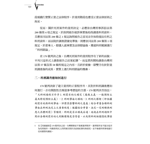 最重要的是,對於死刑的裁量,現行程序制度上的缺憾,我和本書諸位作者一樣,希望有更深刻沉靜的討論。(楊添圍)