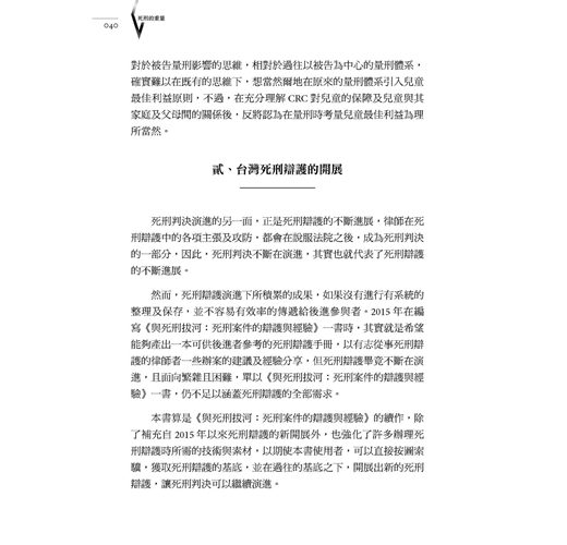 將死刑辯護的經驗與技巧記錄下來,成為一種系統化的知識,能夠出版、傳遞出去,對於正在或將要從事死刑辯護的律師而言,都具有重大意義與極高的價值,能一定程度幫助死刑辯護品質的提升,這是本書出版的意義。(尤伯祥)