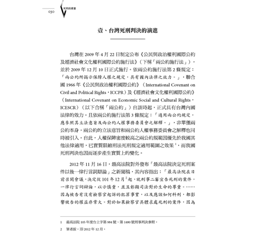 在台灣,廢除死刑至今仍是未竟之業,自兩公約施行法公布施行以來,將國家更積極的人權保障義務帶進個案,對我國死刑案件之量刑有其影響力;然而,死刑量刑之準則及程序的保障,舉凡量刑因素、「教化可能性」、證據調查等問題,都有待建立、釐清和適用。