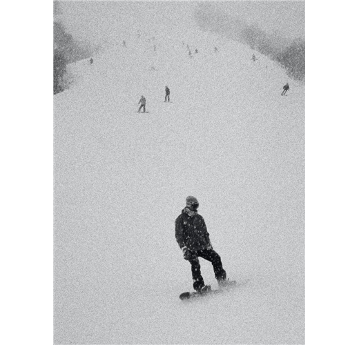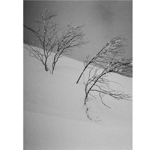 凍結在窗戶上的白霜、臥睡在雪地中的巨樹,或是尚未被積雪覆蓋的腳印、等待被冬陽擁抱融化的雪人,以及飛騰於夜空中的滑雪者;伍佰在滑雪的同時,利用相機篩落出那些發生在大雪中,不為人知的痕跡與光影。