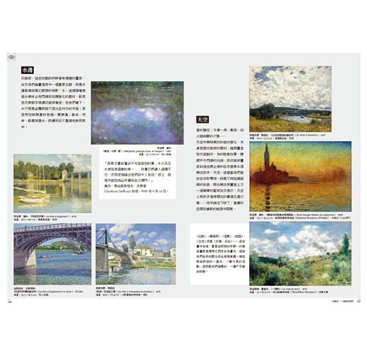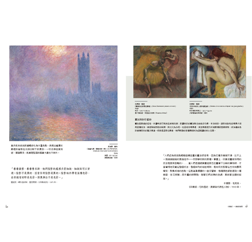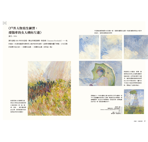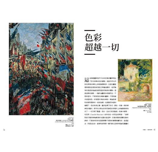 ◆比起在畫室裡重組題材,印象派畫家擁有的是對描繪對象那直接而敏感的體驗;透過這樣的挑戰,一種新繪畫很快相應而生。所有關於美術的規則,無論是學校或學院裡教的,統統捨棄。在激動而快速的筆觸下,色彩取得主導,重新詮釋了形式、調性、印象,一切只剩下震盪、色彩、生命力、流動感。