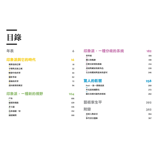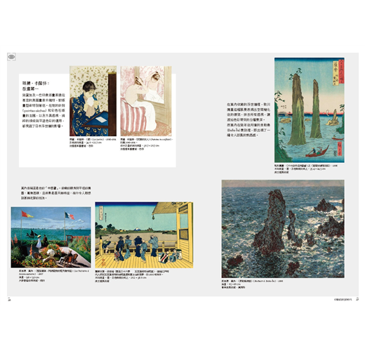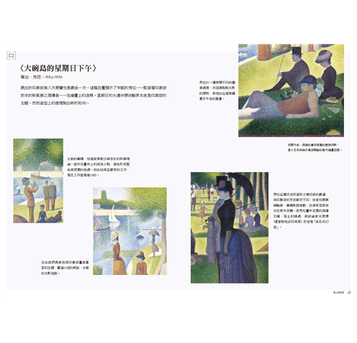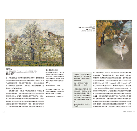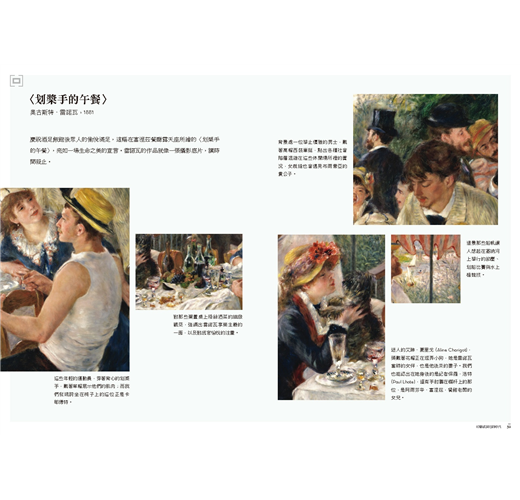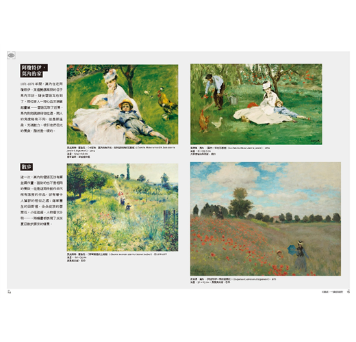 這本《印象派全書》,份量相當足。以四大篇章分別談及印象派生成的時代背景、印象派在繪畫上提出的新視野,作為一種與主流大相逕庭的藝術流派如何生存,以及印象派對後世的影響。透過這本書,我們更能明白何以印象派會是現代藝術的起點:那絕對不是某個天才橫空出世登高一呼,而是一群面對瞬息萬變的世界,想真正用自己的眼睛去看的重度繪畫迷的持續的嘗試(且有別於純粹畫冊或是文集,這本書圖文的比例相當,豐富的圖錄讓人感覺每頁都有彩蛋!)一種事物要能稱得上老派,意味著它曾經是某個時代的先鋒,具備一定的時代意義,印象派嘛,正是老派才不退流行的典範啊!