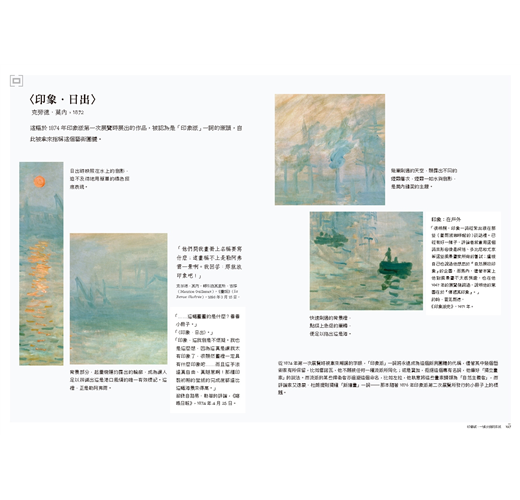 印象派在一個全新的時代中崛起,影響了後來眾多產業的審美發展如攝影、音樂等,同時也大大改變了展覽、畫廊、經銷商和作家,甚至是城市的發展和休閒活動。本書將從歷史的面向,帶給讀者全新的印象派觀念,以及數個在藝術史中激勵人心的時刻,並以極具代表性的畫作對應整個印象派的發展,不僅是欣賞藝術大師的經典之作,更透過歷史背景深入理解在舊時代下,如何為「新思維」發聲、反抗。書中充滿你從沒看過的印象派圖像及故事,以及關於「解放」的定義。