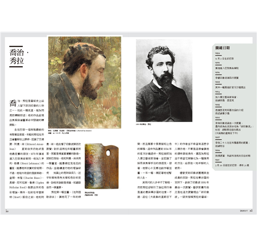◆作為各個領域的革命者與創新者,印象派孕育且帶來了許多豐富的進展,且將烙印在後來持續湧現的前衛風潮裡。1886年印象派第八次展覽,出現了新成員秀拉、 西 涅 克。新印象派是由秀拉開始的,他將筆觸的分割與純色的運用推展得更遠。秀拉的點描派,幾乎是逐字逐句地,執行著科學家謝弗勒的色彩同步對比理論——印象派原本即是受到他的啟發。