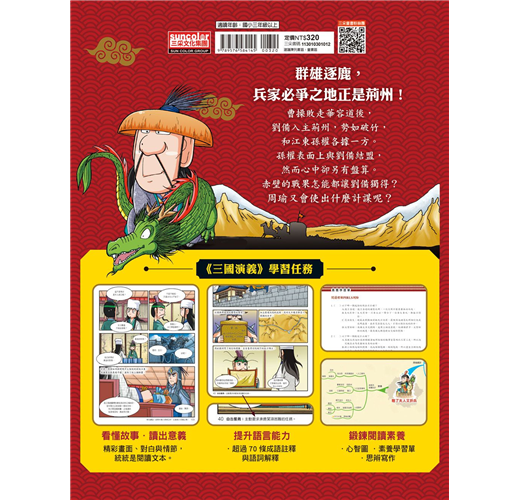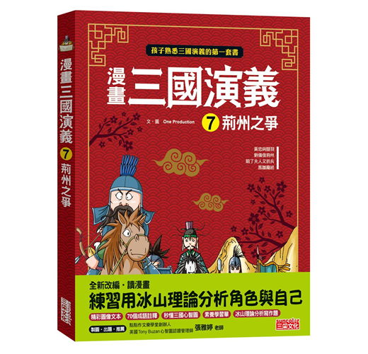 《三國演義》可說是東亞最傑出的歷史小說,也是跨越時代、流傳最廣、影響亞洲最深的暢銷名著。這套全新改編的漫畫,以誇張的人物設計、配合讀者的情節與對白,保留了「鬥智優於鬥力」的東方智慧,讓孩子們享受閱讀《三國演義》的樂趣,以作為孩子有一天閱讀原典的基石。除此之外,本書也延請「點點作文樂學堂創辦人英國Tony Buzan 心智圖認證管理師」張雅婷老師,特別以漫畫作為文本,撰寫【秒懂三國演義心智圖】,並編寫【閱讀理解PIRLS測驗題】與【冰山理論分析寫作題】。