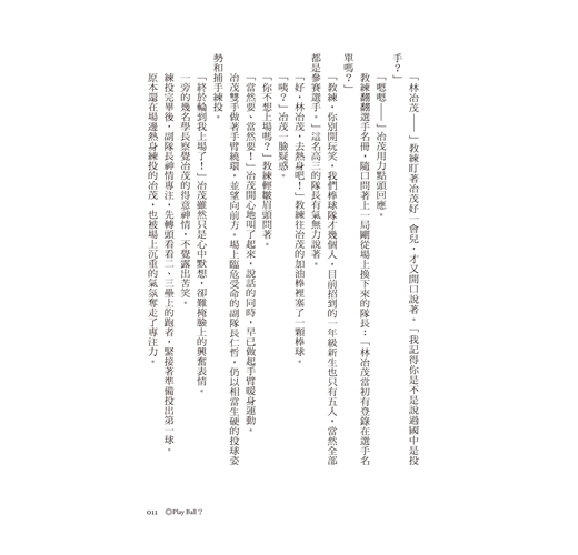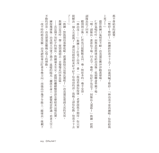 「林冶茂—」教練上下打量了冶茂一番。「我沒看過你投球,老實說我不期待,你只要能解決一個人次就夠了,讓這局趕快結束好不好?你成功的話,我晚上請你吃飯,快看不下去了—」