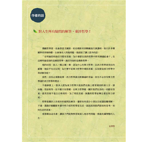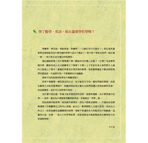因為媽媽叫我要學、因為教科書裡有、因為不想被老師罵⋯⋯不過你有這麼做過嗎?仔細觀察自己的內心深處,給自己一點時間對自己的人生進行思考,成為自己的主人。如果能擁有這種寶貴的時間,那麼各位小朋友,不管遇到多大的風雨也不會動搖。這雖然只是一本書,一些小小的哲學故事,但是希望透過這本書能夠幫助各位實現更大的希望和夢想。