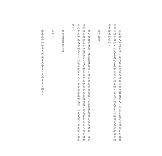 寫作對我而言,不為了什麼,本身就具有實踐的意義,而我也在走了這麼一趟寫了幾十萬字我才發現我想要寫的是什麼,能讓這個實踐更加地貫徹寫作的活動價值,我想要完成的東西是像本書這樣的完全出自於我,或說就是「我」的東西,這讓我感到滿足,也讓我不後悔像機器般地完成那麼多書評,因為是在這個過程中才催生出我的寫作動能,也是在這個過程後我才找到對我而言的寫作意義。