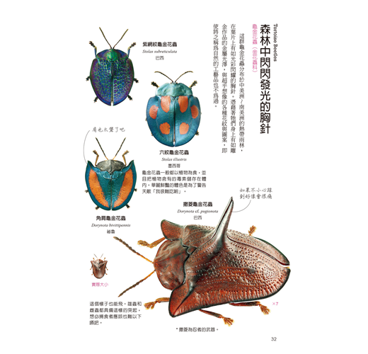 2.搭配大量圖片,解說詳盡,透過本書可認識世界各地的奇異甲蟲。