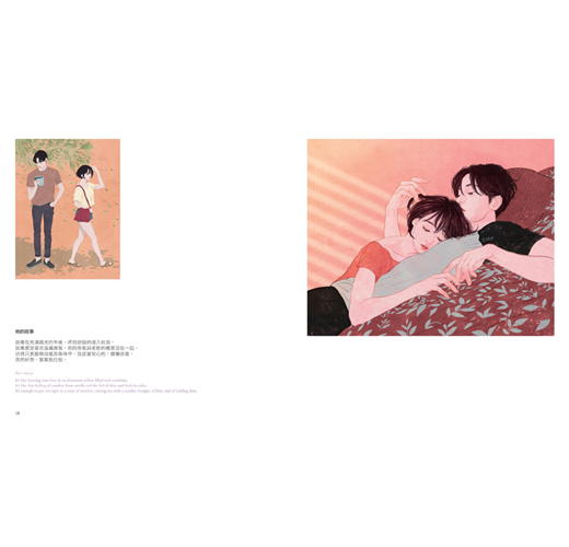 在Zipcy筆下,再稀鬆不過的日常變成一張張電影截圖,所有現實面都被她柔焦、淡化,取而代之的是暖黃色的曖昧濾鏡。畫中的兩人像是上輩子約好了,一起誕生於漫漫宇宙裡某個不起眼的星球,前一世把苦都先用盡,這一生,只需要相愛就好。──盈青