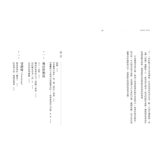 本書從業界編劇的角度出發,點出好的影視、劇場或小說所必須具備的七大元素,讓有志創作者不僅不會浪費寶貴時間在無效的概念上蹉跎,一但開始創作,也可以事半功倍。