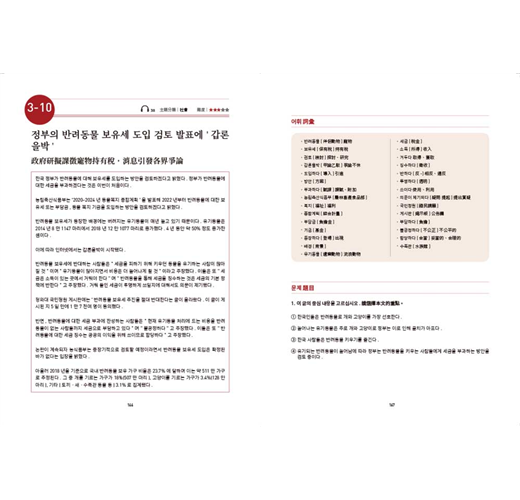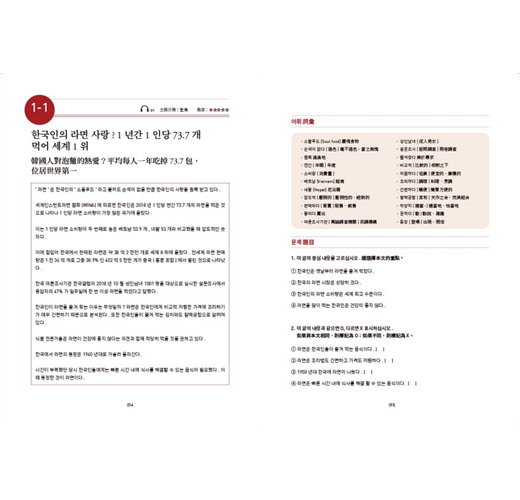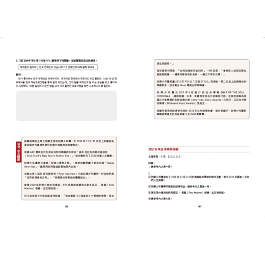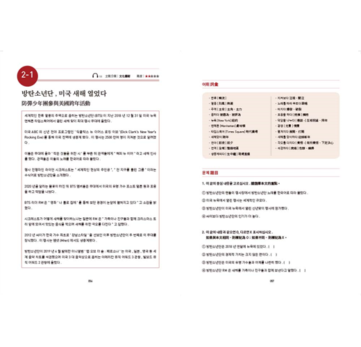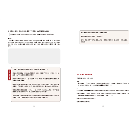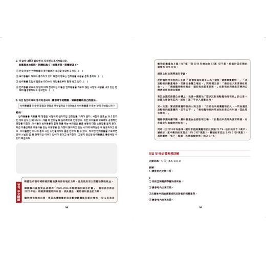 每篇文章結束後,藉由閱讀題組訓練學習者掌握文章核心的能力;是非題則多以換句話說的方式出題,並附上文章中譯與詳解,幫助學習者更加理解韓文表達的邏輯。