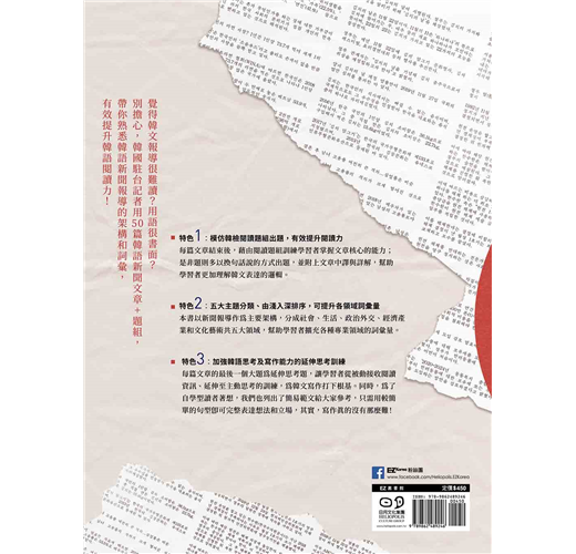每篇文章的最後一個大題為延伸思考題,讓學習者從被動接收閱讀資訊、延伸至主動思考的訓練,為韓文寫作打下根基。同時,為了自學型讀者著想,我們也列出了簡易範文給大家參考,只需用較簡單的句型即可完整表達想法和立場,其實,寫作真的沒有那麼難!