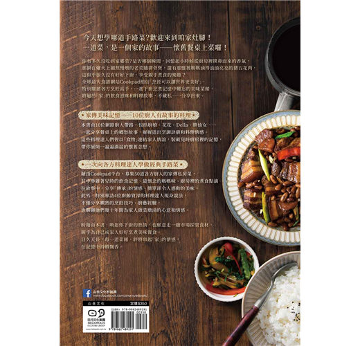 一道菜,是一個家的故事。藉由Cookpad平台募集,有機會挖掘到許多家庭動人的料理故事,其中參雜著兒時的飲食記憶、最懷念的媽媽味、廚房裡日常的煮食點滴……書中蒐羅50道各方廚人的家傳私房菜,是各家阿嬤或媽媽傳承下來的珍藏食譜,包含了台菜、外省菜、客家菜、素菜等料理,在故事中,分享「傳承」的情感、簡單卻令人感動的美味。