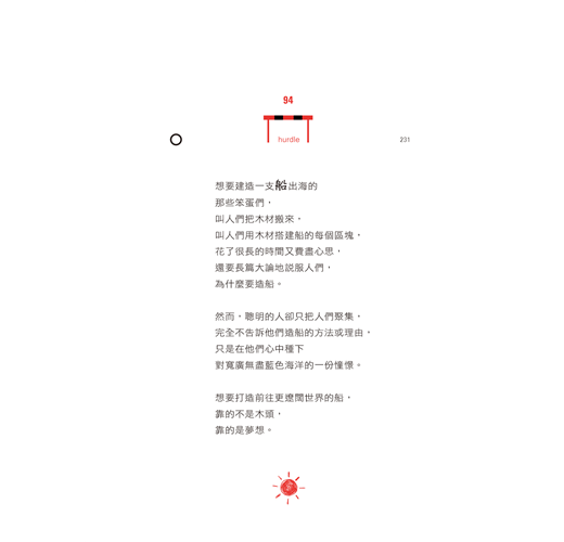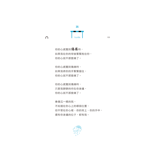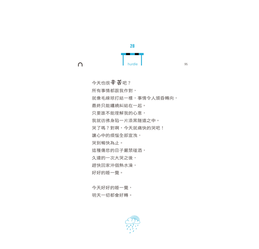 不同於市面氾濫的溫暖療癒系圖文風格,作者大膽呈現現代人的心理和困境,每則圖文以欄杆圖為意象,象徵跨越人生的難關。簡單線條卻教人印象深刻的人物插圖,給予辛苦的人們同理和打氣。