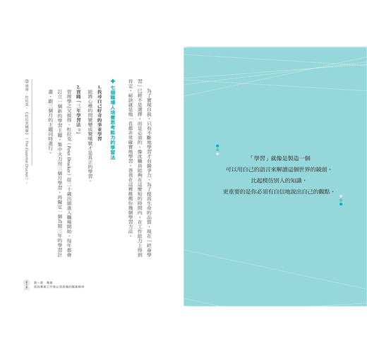 ◆專業──不要一味埋頭工作,也要持續開發自己的潛力學習就像是製造一個可以用自己的語言來解讀這個世界的鏡頭,不是等著世界抛出問題給你,而是心中要先提出疑問,再自己去找尋找答案,這才是真正的學習。