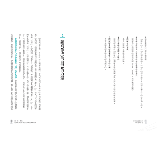 哈佛大學針對一九七七年之後畢業的一千六百名四十多歲的哈佛校友進行問卷調查,當問到「以前所學對你目前的工作最有幫助的是什麼?」時,有九○%以上的回答都是「寫作」;當問到「你覺得自己未來哪一方面能力要再繼續努力提升?」時,最多的答案也是「寫作」。寫作能力好,可以早點下班,也可以早點升職,如果寫作能力不好,可能就是提早離職了,就算是新進職員也不例外。現在區分新人工作表現的標準,除了外語能力之外,國文的寫作力也很重要。