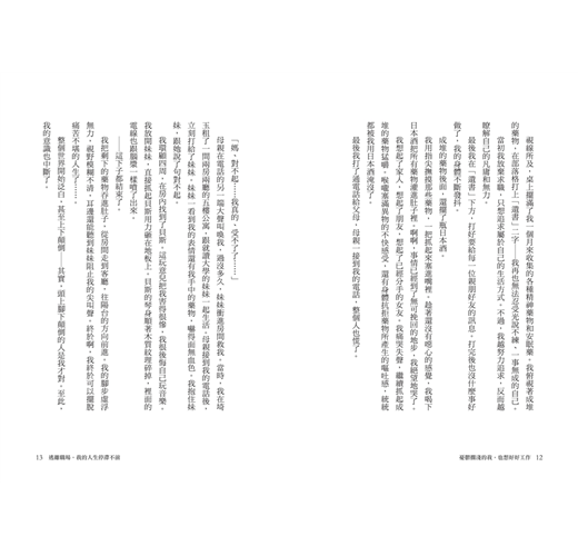 我把剩下的藥物吞進肚子,從房間走到客廳,往陽台的方向前進。我的腳步虛浮無力,視野模糊不清,耳邊還能聽到妹妹阻止我的尖叫聲。終於啊,我終於可以擺脫痛苦不堪的人生了……。
