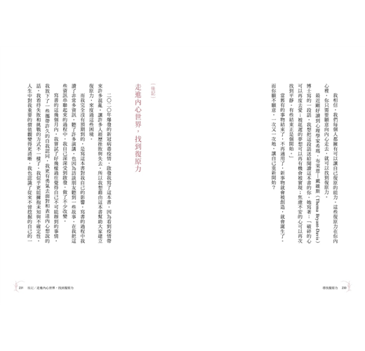 同樣的,也期望你能透過《尋找復原力》這本書,一起找出從逆境中彈回並撫平傷口的那股力量。
