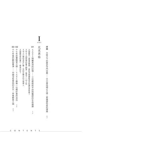 Part I 厄夜再臨 01 SARS隔離黑洞的記憶──三位歷經和平封院醫師的生命選擇 ‧隔離是一道電車難題,誰能為被碾壓過去的犧牲者負責? ‧從B8病房裡的奮不顧身,看見了一切人性 ‧池上小鎮的濟世仁醫,世紀災難中的沉冤罪人 ‧隔離檢疫的量尺,標準何在? 02十七年前實驗室之謎──SARS最後一位確診者的自白 03十七年後的翻拍重演──中國沒有單純的天災,背後都是人禍