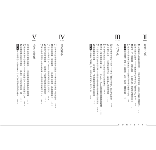 Part V 全員台灣隊 19編織台灣防疫網的雙手──從里幹事到接線員的防疫現場 20傳遞愛與使命的手譯員──沒有障礙的人,只有障礙的社會 21衝鋒前線的民間消毒師──背負三十公斤迅速武裝上陣 【圖文輯】罩住疾病的二公克之重:一片口罩如何送到你我手上