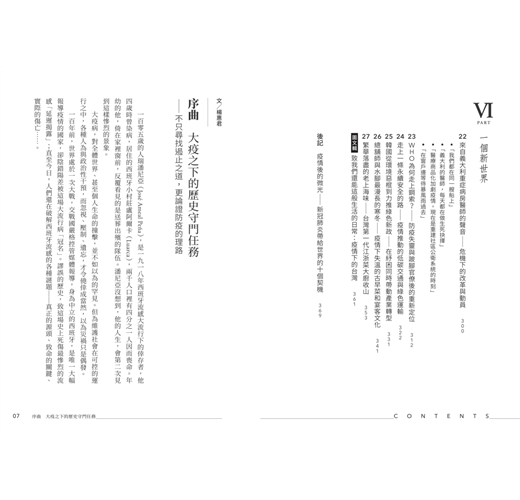 Part VI 一個新世界 22來自義大利重症病房醫師的聲音──危機下的改革與動員 ‧「我們都在同一艘船上」 ‧「義大利的醫師,每天都在做生死抉擇」 ‧「醫療商品化加劇疫情,現在是重建社區公衛系統的時刻」 ‧「在窗戶邊等待暴風雨過去」 23WHO為何走上鋼索?──防疫失靈與跛腳官僚後的重新定位 24走上一條永續安全的路──疫情推動的低碳交通與綠色運輸 25韓國從環境惡棍到力推綠色新政──在紓困同時帶動產業轉型 26總舖師與水腳最漫長的寒冬──疫情下失溫的古早菜和宴客文化 27繁華落盡的老上海味──台灣第一代江浙菜大廚收山 【圖文輯】致我們還能這般生活的日常:疫情下的台灣