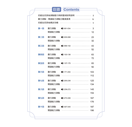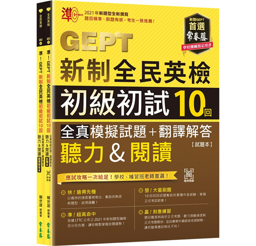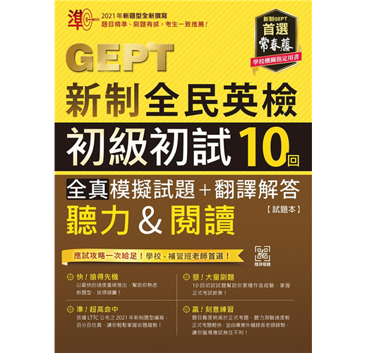 為因應此次改版,本公司亦在第一時間掌握由財團法人語言訓練測驗中心(LTTC)頒布的最新考題,經中外編輯多次研擬、網羅各種新鮮題材,最終完成這本完全仿真的《準! GEPT 新制全民英檢初級初試 10 回全真模擬試題 + 翻譯解答(聽力&閱讀)》。為讓讀者能快速熟悉新制全民英檢考試方向、增進應考實力,我們亦在試題本內提供「應試攻略」,為讀者深度剖析新制題型的出題脈絡並分享解題技巧,且此套書的難易度故意設定為比實際考試再難一點。同時為了不方便使用光碟放音機的讀者,我們貼心地將音檔上傳雲端,只需掃描 QR Code 便能進行測試。各位讀者若能善用此套書,相信必能全面「贏」戰新制考題,更能在初級測驗中「初」類拔萃、勇奪高分!祝大家學習愉快!