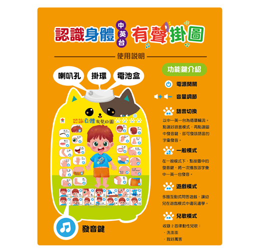 ●簡單操作:「語言鍵」一鍵切換中、英、台三種語言模式。英文請來專業外語錄音員錄製,發音純正,給孩子最標準的三語聽力與口說引導;「一般模式鍵」還能一次播放三種語言,適合用於總複習。