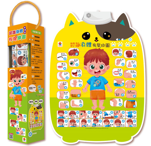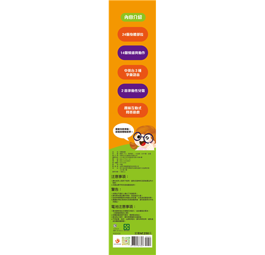 ●「認識身體」主題:每個孩子都必須認識的24個身體部位+14個情緒、動作與身體狀態,中英台三種字彙語音搭配全身及局部放大的可愛插圖,奠定孩子正確認知,也增添學習樂趣。