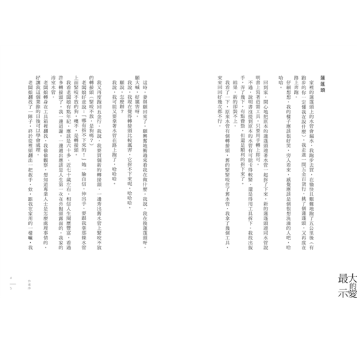 我心想,這條水管平常都住在浴室裡,從沒出遠門,卻看過我一家大小的裸體,還包括狗的,今天第一次出門就被這麼多陌生人碰觸,不知道它心裡會不會緊張?