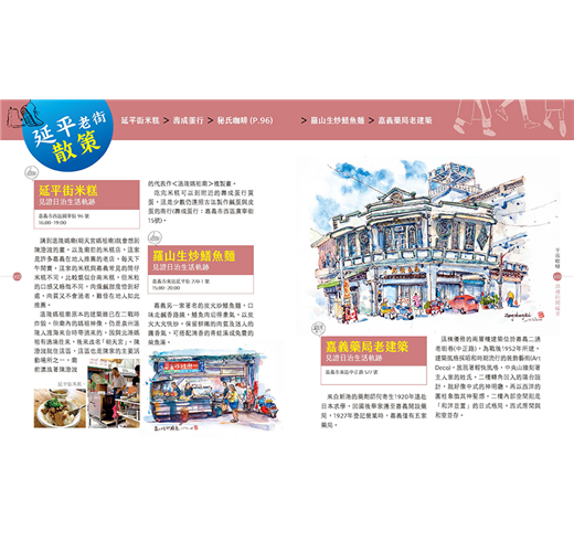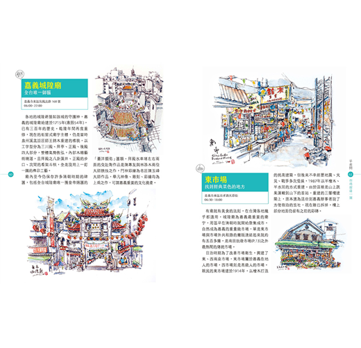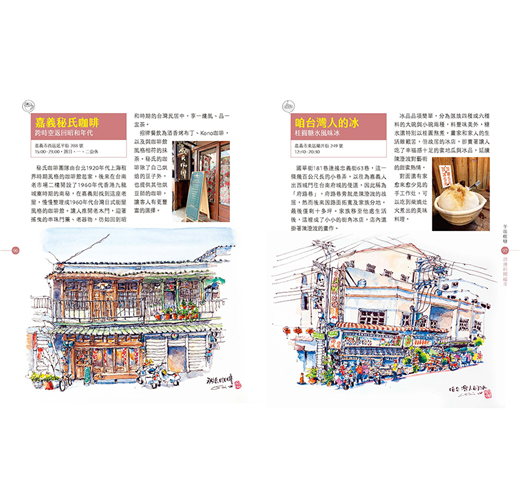書中精選10個嘉義在地風景,囊括市場街景、攤車小販、日治時期建築、文青咖啡小店和台式平房老屋,