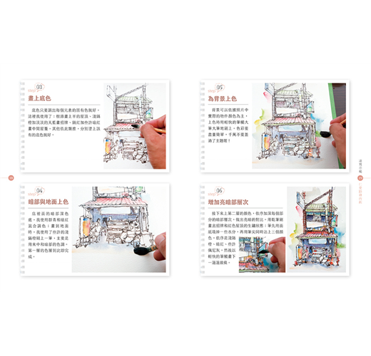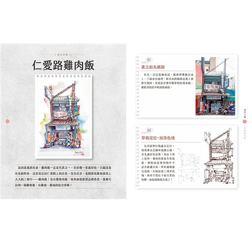 搭配豐富詳細的步驟說明,你將學會如何把台灣在地風景畫成一幅幅生動的速寫畫作。
