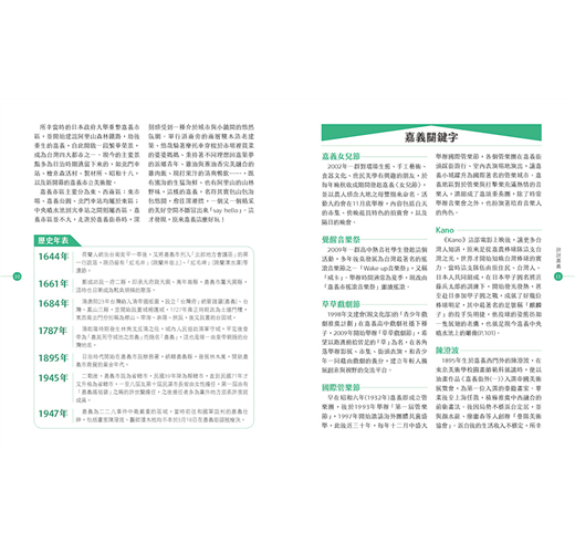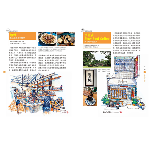 全書分為六大單元,按飲食、藝文、建築和不同地區分門別類介紹,以細膩文字書寫獨到見解,搭配絕美的水彩速寫畫作,帶你細看嘉義讓人心曠神怡的小鎮街景、耐人尋味的建築風采、讓人欲罷不能的台式美食,以及在地文創的新生活力。