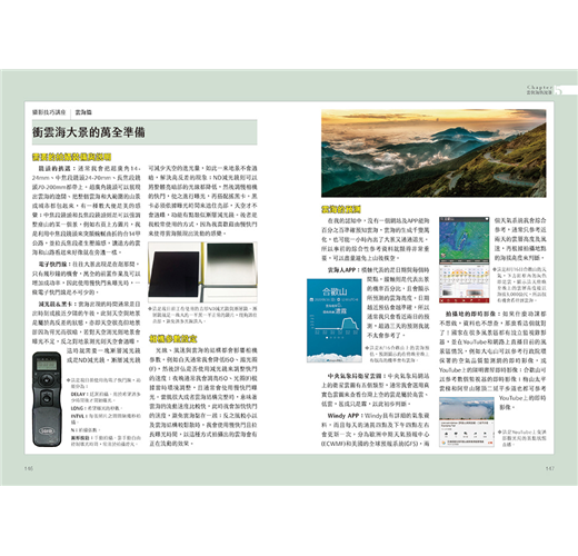 ◆提供天氣預估、APP使用、設備器材、構圖與參數設定等拍攝知識基礎。