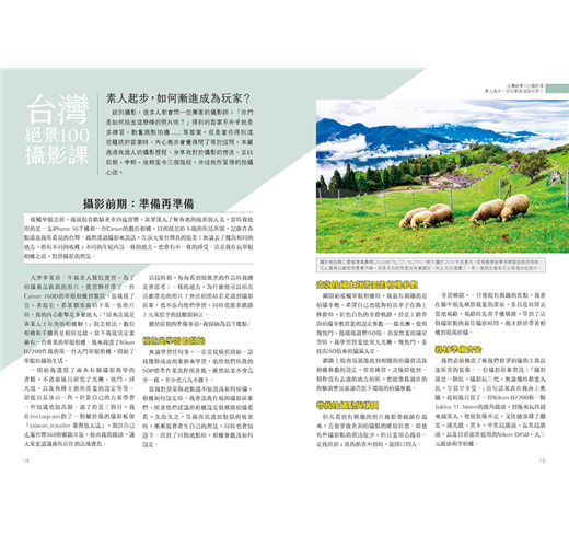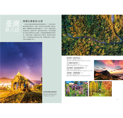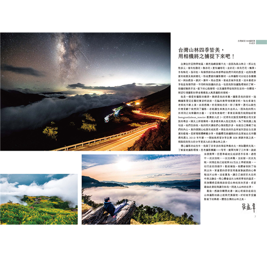 「從我拍過成千上萬的照片之中,精選這二十張經典景色分享給大家。這些照片呈現我鏡頭裡許多難得的天文現象,除了有像極紐西蘭場景的魯冰花、壯闊如仙境的雲海繚繞、經典浪漫的全景弓形銀河照、難能可貴的天象萊狀雲,以及唯獨守候才能拾獲的絕美日出與夕陽。首先欣賞這二十件我心目中的佳作,接著,就和我一同進入山林世界的探險吧!」--本書作者 吳孟韋(摘自內容【Gallery】臺灣旅人誌精選,台灣最美20景)