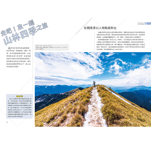◆ 各主題還有加強學習:針對不同季節、時間點、拍攝目標,完整剖析山林風景攝影的要領