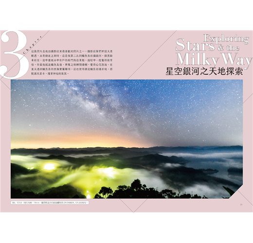 ◆ 全書分為六大主題攝影課:四季、晨昏、銀河、山中祕境、雲海、夜景
