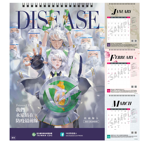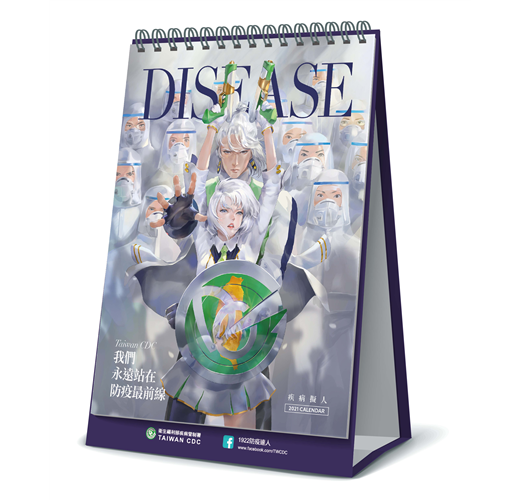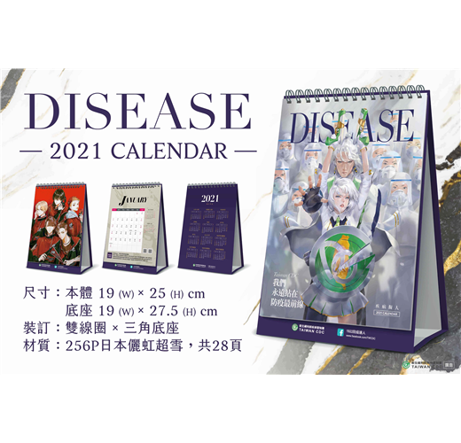 延續2020年,疾管署再度發行「Taiwan CDC我們 永遠站在防疫最前線」2021年疾病擬人防疫桌曆,這份桌上年曆除了收錄精美的疾病擬人作品,也將防疫的概念融入日常生活中,時時提醒大家預防傳染病的重要性,期望能吸引更多民眾從了解疾病開始一起預防疾病,也希望在COVID-19疫情時期陪伴並守護國人健康。