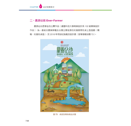 1. 2018 德國紅點概念設計獎:榮譽獎Honorable Mention「農源佔地Ener-Farmer」能源科普教育桌遊設計。